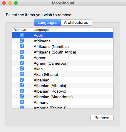 Monolingual is small and easy to use program used for removing unnecessary language files. The software frees up disk space by deleting localization files from your Mac computer. Like most people, I bet you use your computer in one language which is English; thus, no need for data to support other languages that you may never use. Monolingual allows you to free up several megabytes that can be used to store audio and video files.